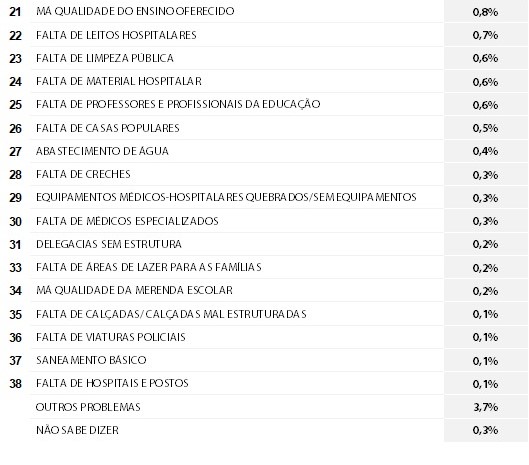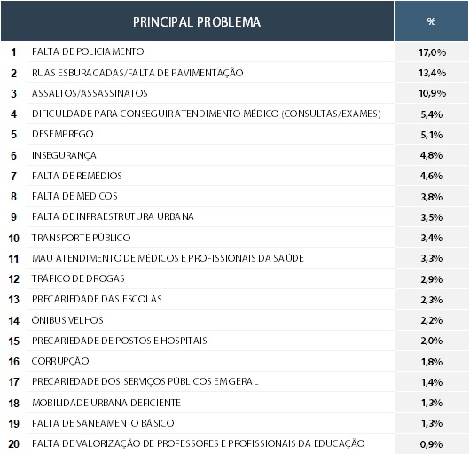 Os três primeiros colocados foram Falta de Policiamento, com 17,0%, Ruas Esburacadas/Falta de Pavimentação, com 13,4%, e Assaltos/Assassinatos, com 10,9%.