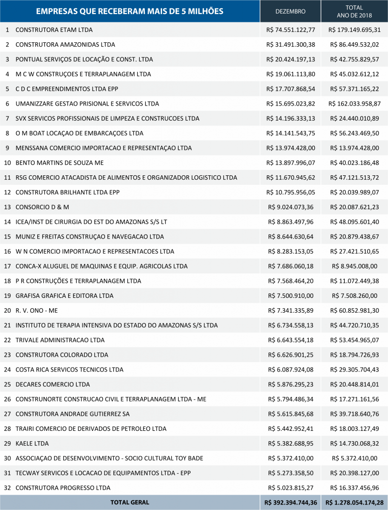 Analisando os pagamentos realizados pelo Governo do Amazonas no triênio 2016-2018, estabeleci, como linha de corte, apenas os fornecedores que receberam mais de R$ 70 milhões, no período. E o resultado obtido foi de 32 empresas.
