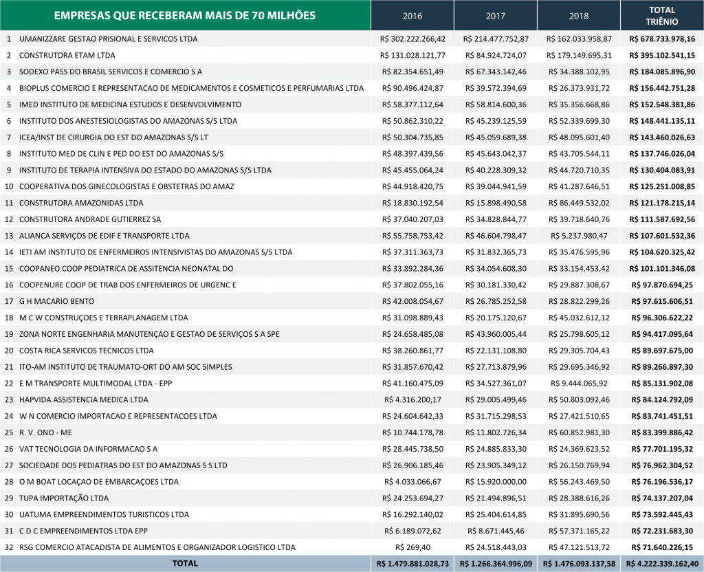 Analisando os pagamentos realizados pelo Governo do Amazonas no triênio 2016-2018, estabeleci, como linha de corte, apenas os fornecedores que receberam mais de R$ 70 milhões, no período. E o resultado obtido foi de 32 empresas.